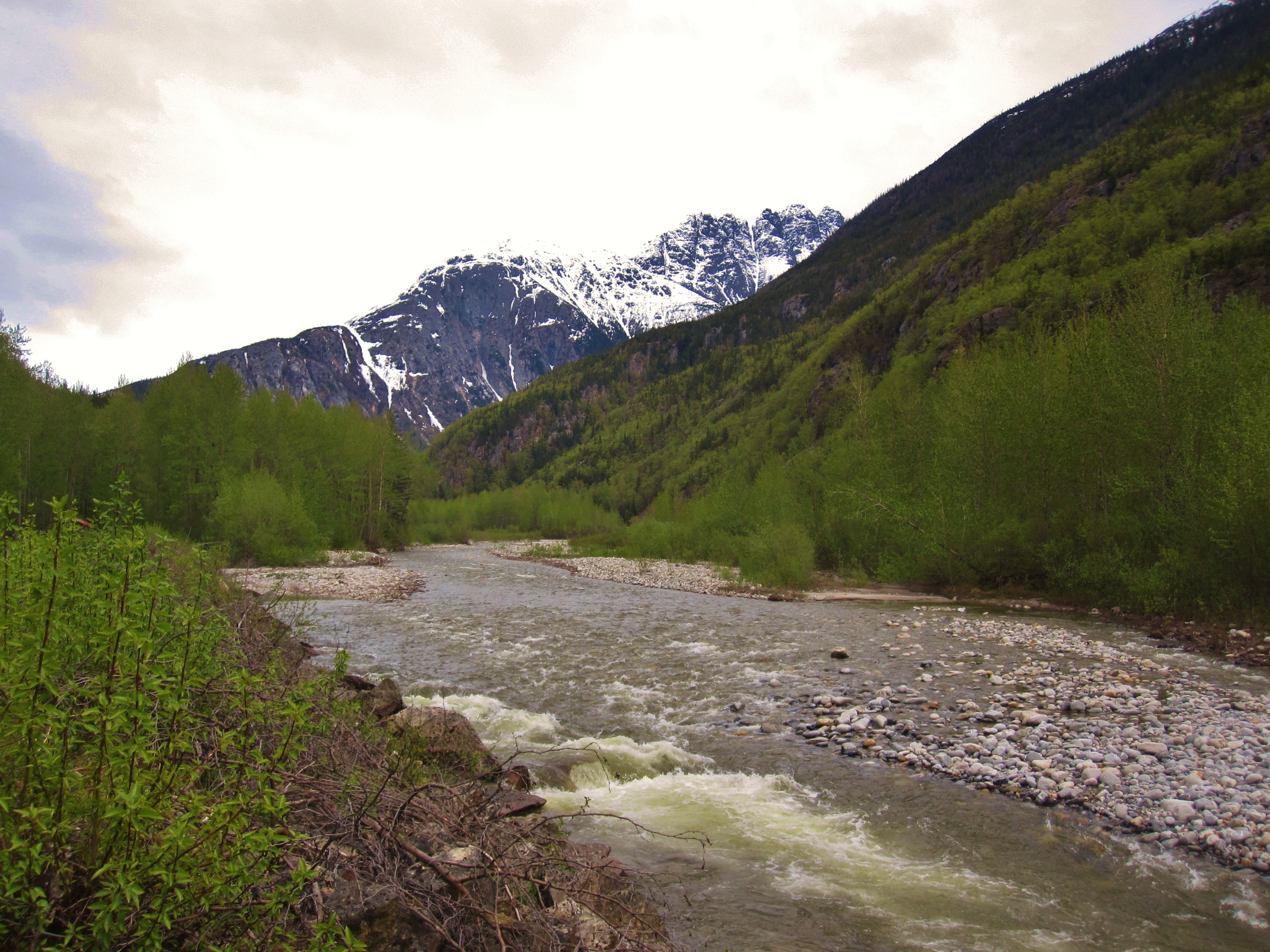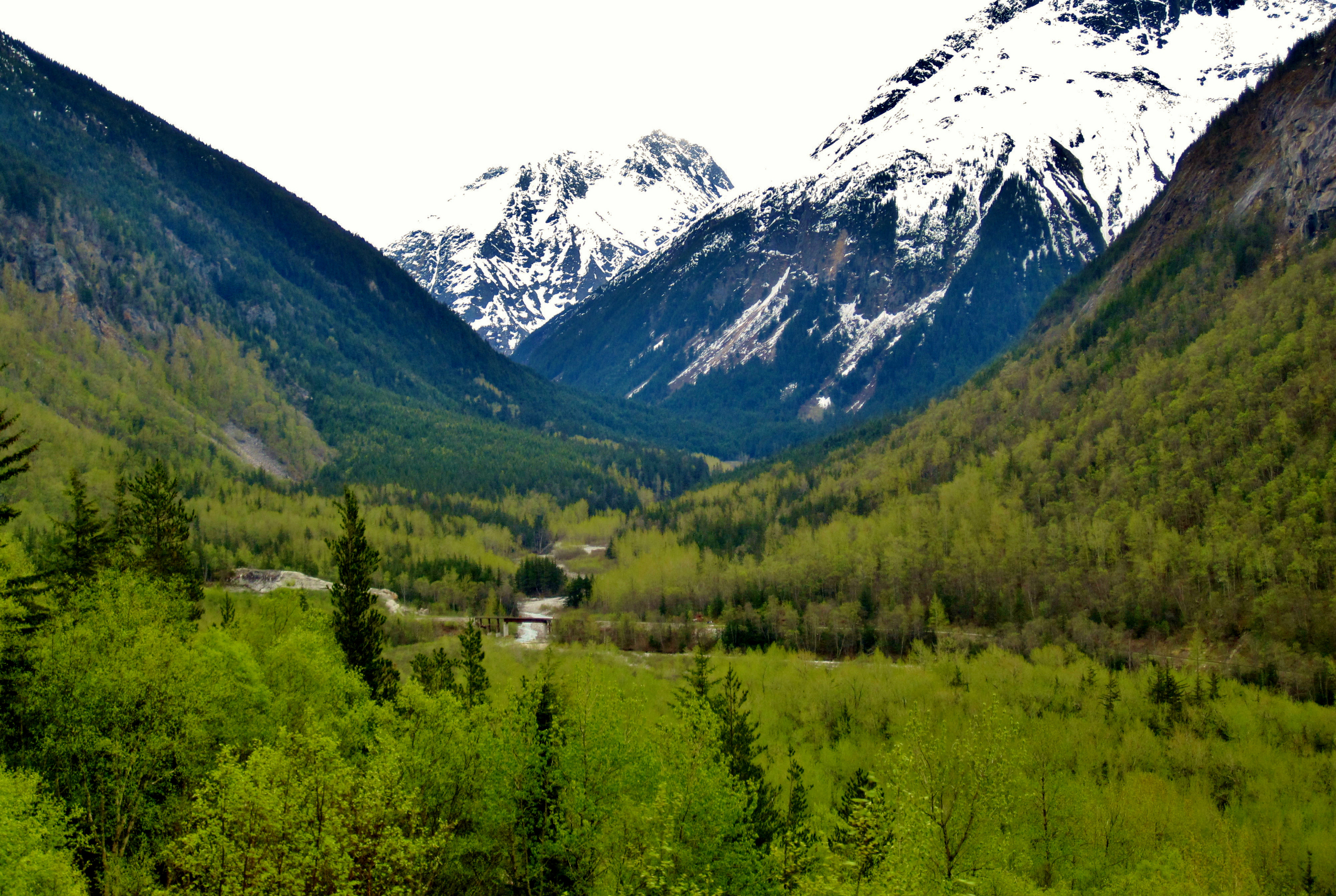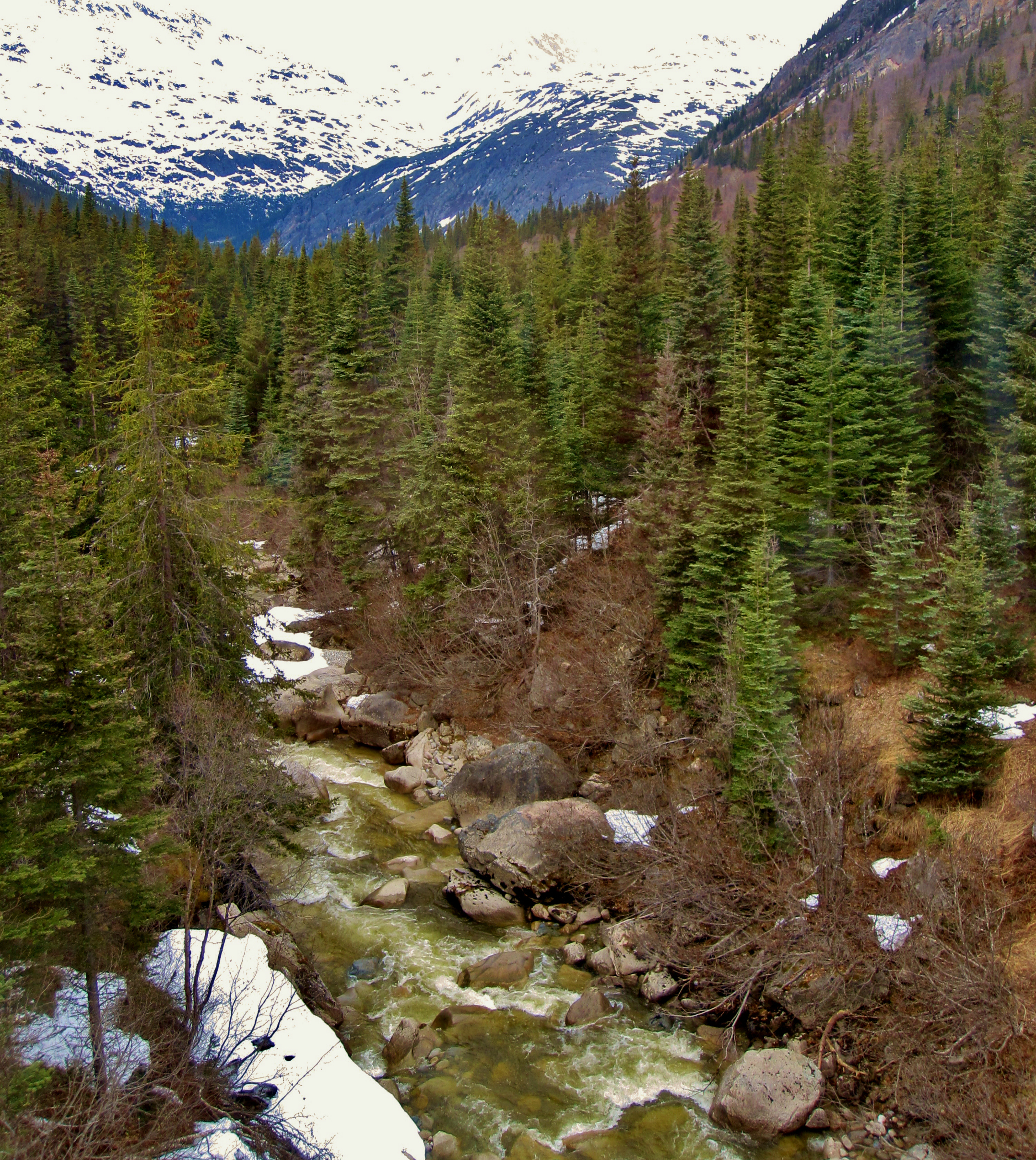 The railroad was built and used during the gold rush to transport men up into the wilderness – a project that solidified Skagway as a major boom town of the Klondike Gold Rush. The ride is pleasantly slow and scenic, the snow giving way to lush mountainsides of green trees and cascading waterfalls. There are different shades of green, some bright like spring and others deep and hearty, the latter represented by the winter-tough tall pines.