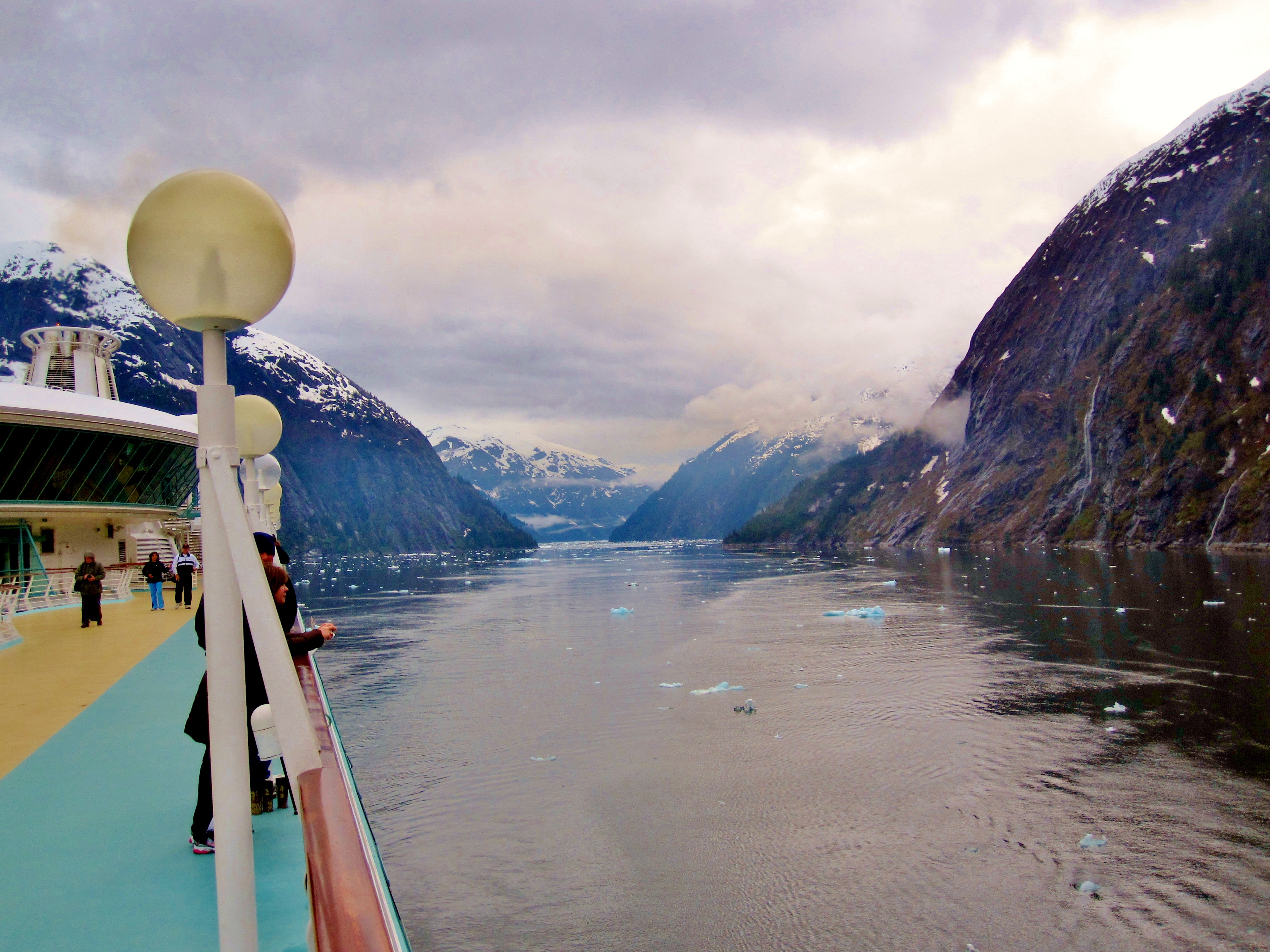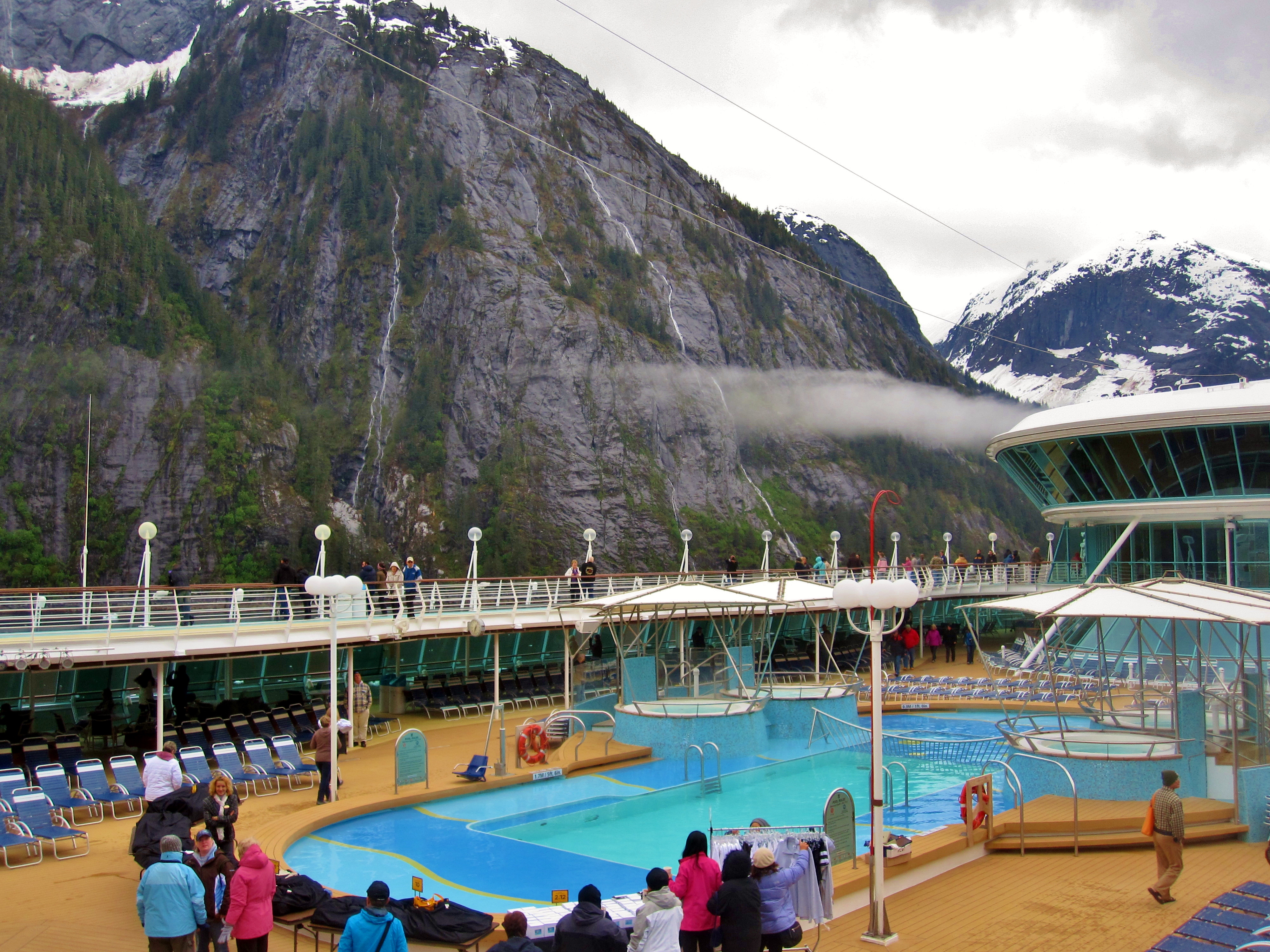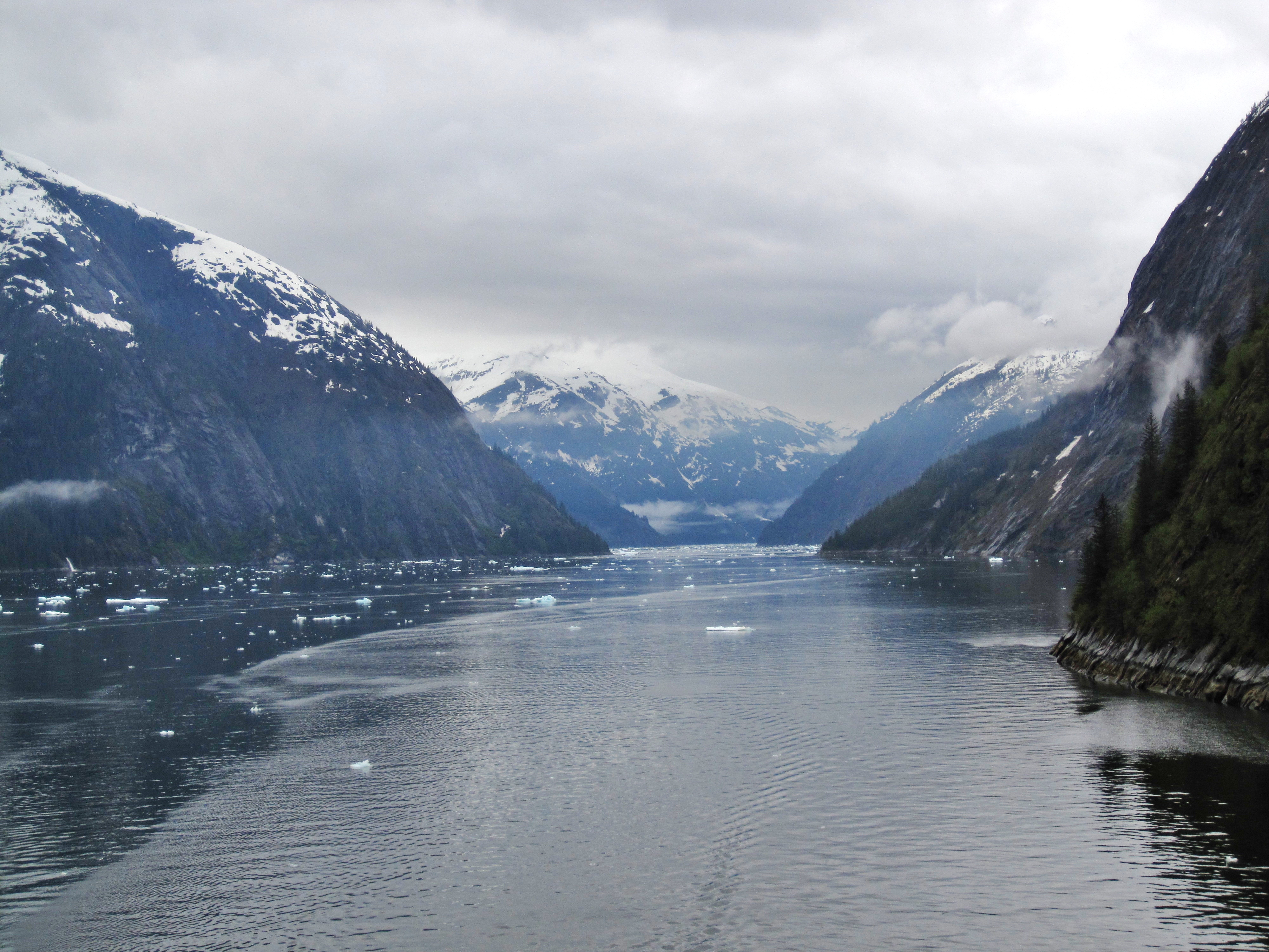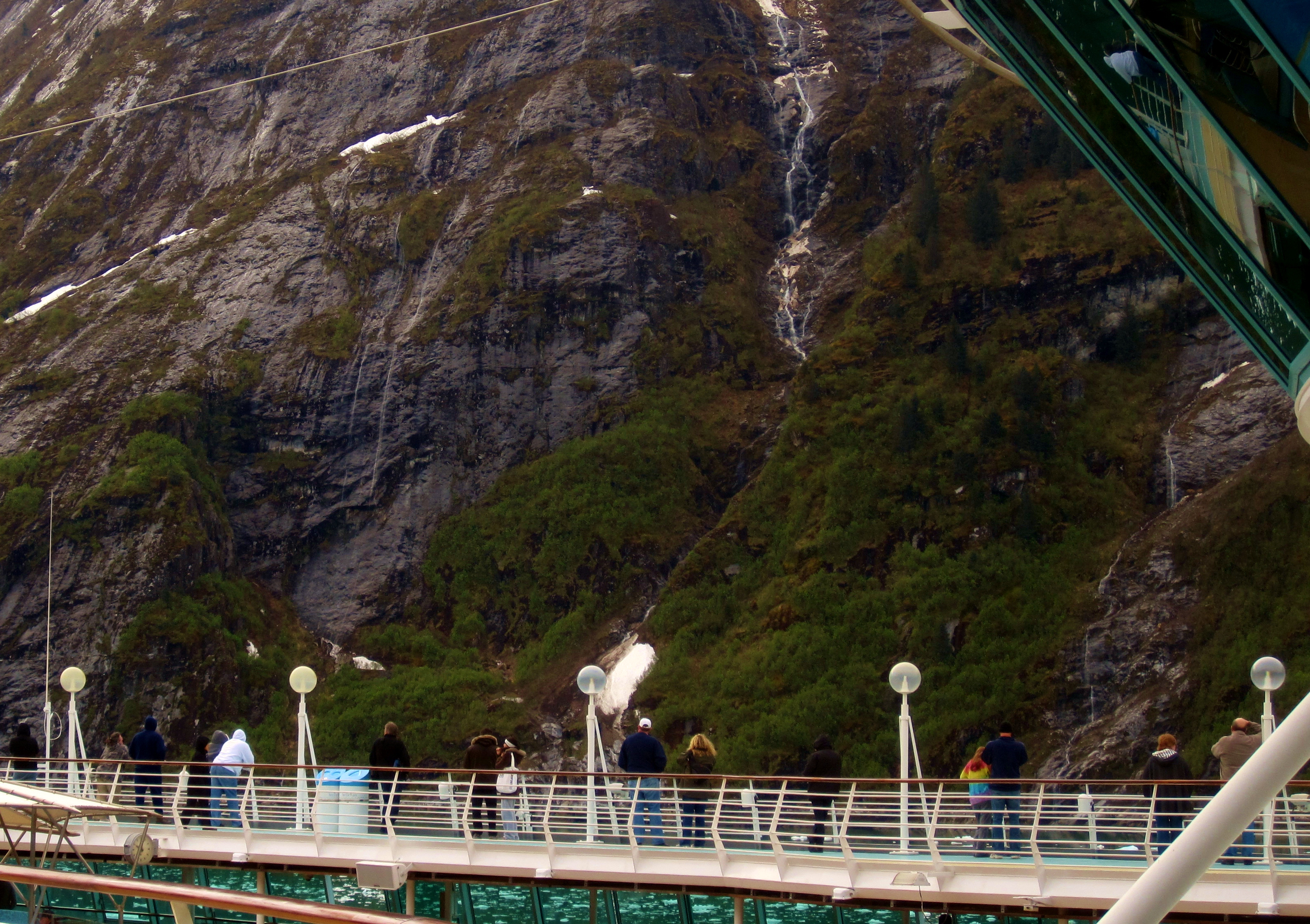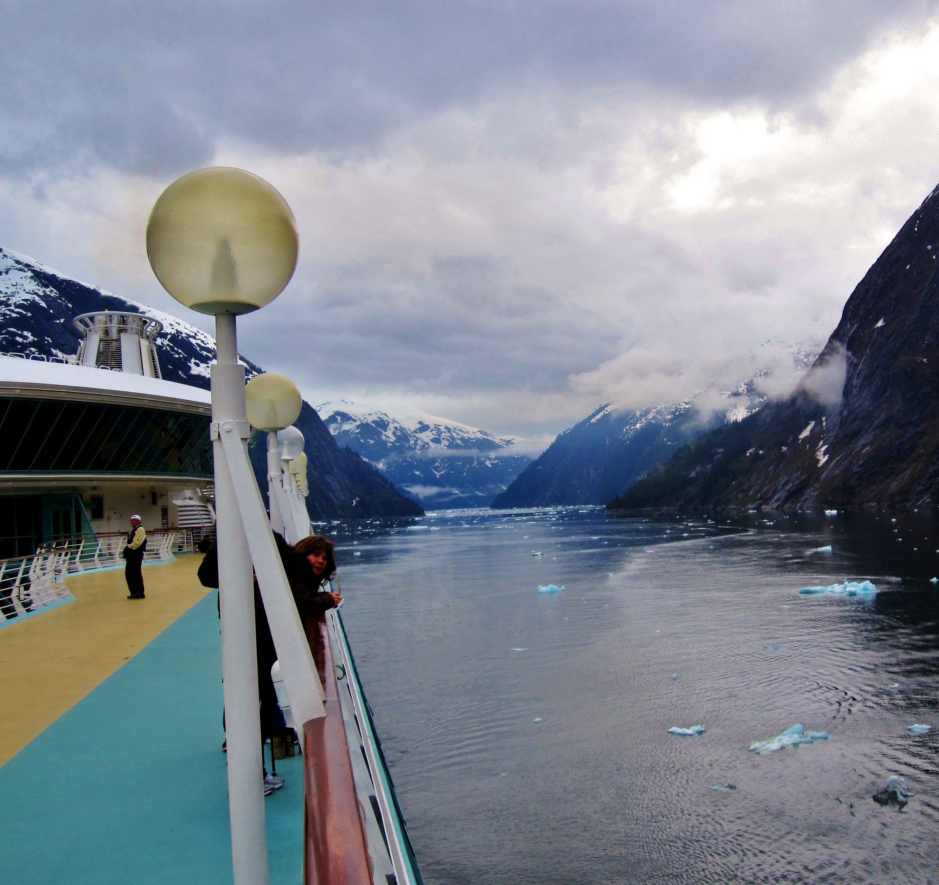 I’m currently sitting in a lounge that’s located on the top deck of the Rhapsody, writing from a table that sits in front of floor-to-ceiling windows. We’re directly in front of Dawes Glacier, slowly spinning in a circle (we’ve been here for about 20 minutes now). This is the second arm, or channel, that we’ve sailed down today. The ship has consistently been about 100 yards from the shore on both the port and starboard sides, and the mountains, glaciers, pines, snow, waterfalls and low-hanging clouds have filled the windows since Sunday morning.