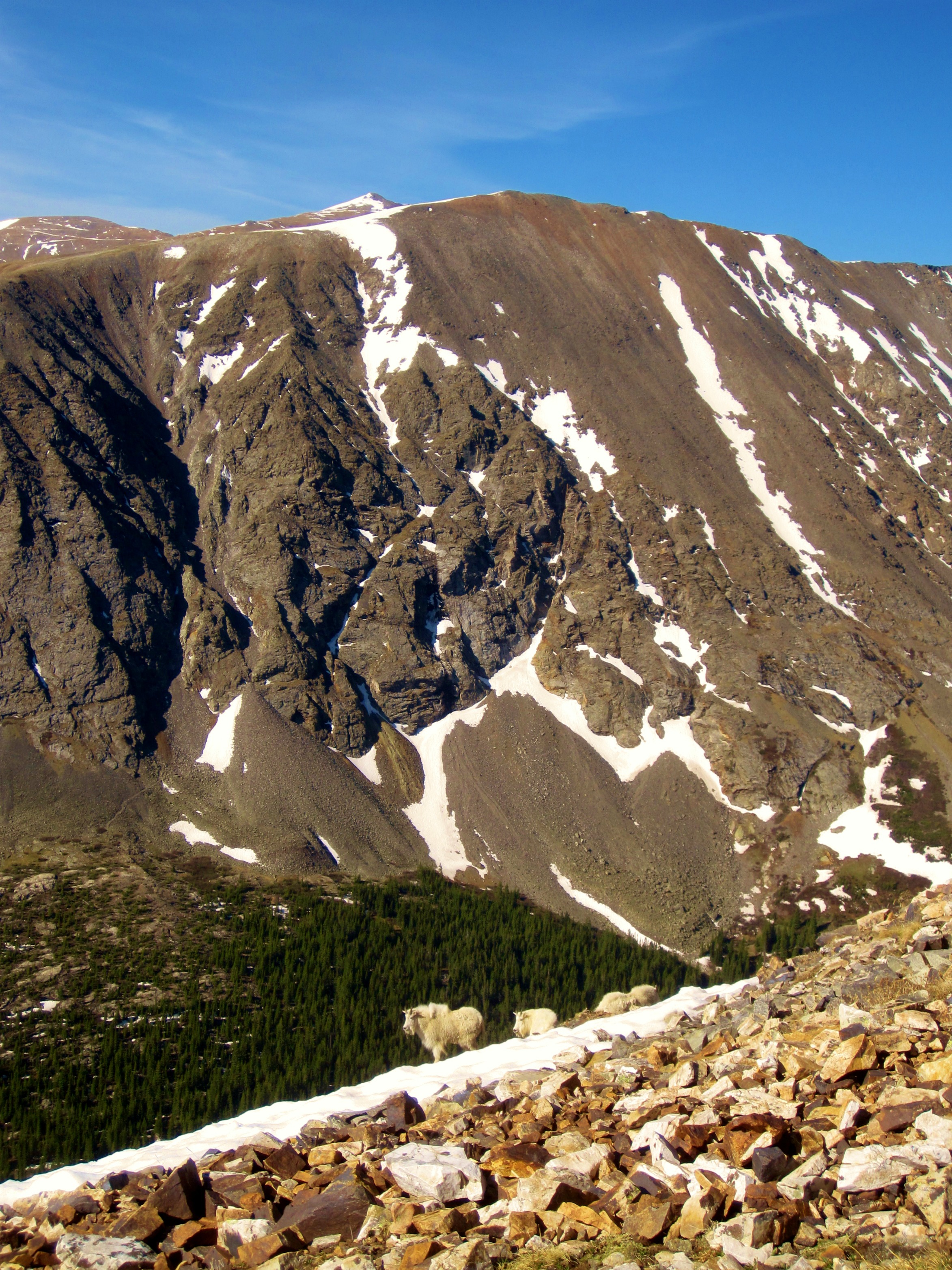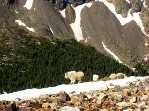 We were about a mile into the three to four mile ascent, and we had just come across a pack of mountain goats on the snow-covered rocks. The dog chased them as far as he could over the ridge, stopping when the pitch became too intimidating, looking down at the goats that now stood comfortably on the side of the mountain.