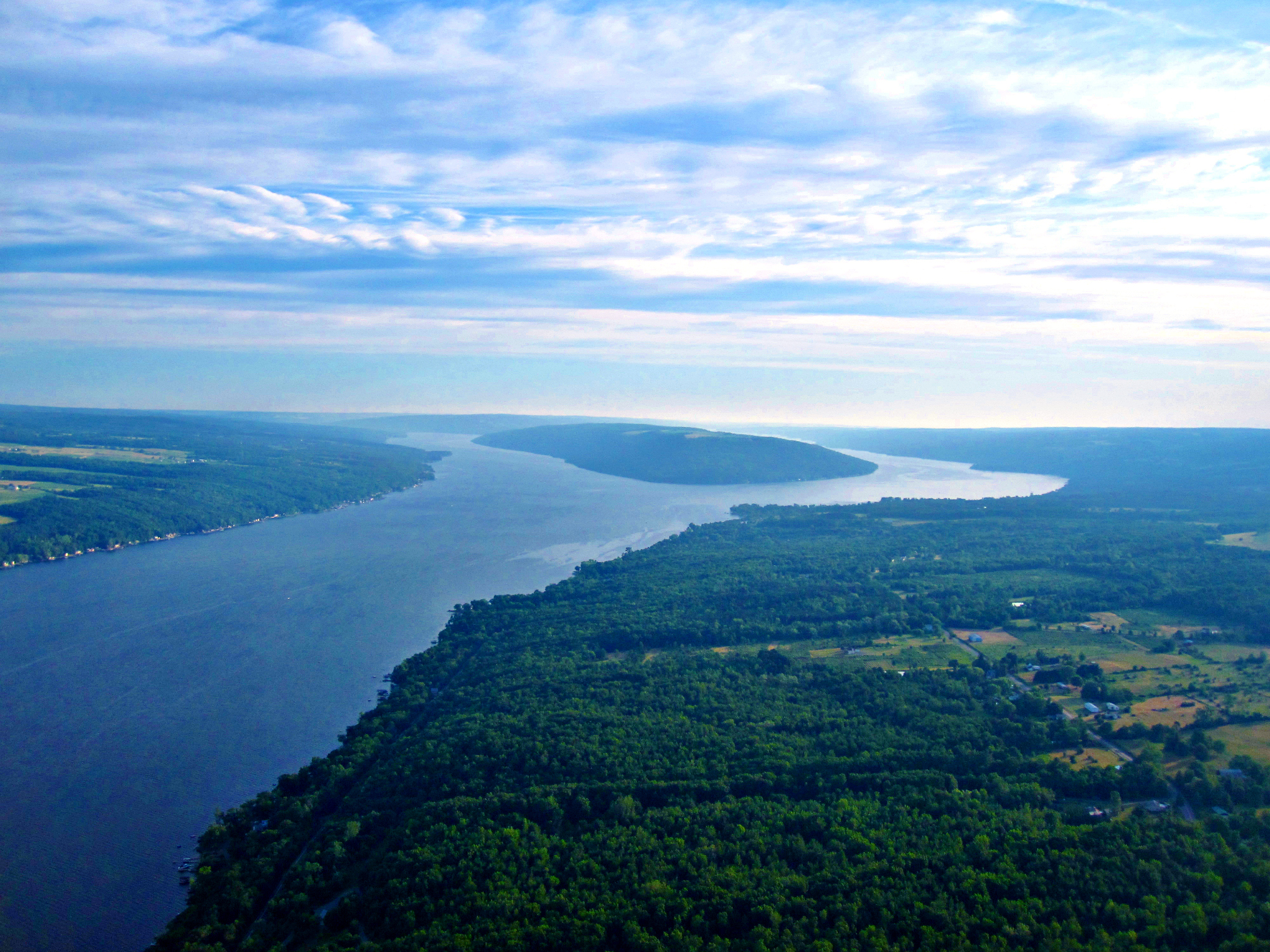We didn’t just take off and drift high into the sky – we cruised a few feet over the treeline, looking down into the forest and seeing the white-tailed deer hopping through the dew-drenched morning. Then we hit Keuka Lake, slowly floating past the fishing boats and the flocks of ducks. Balloons can apparently do a touch-and-go on water given the right conditions, but the wind kept us moving and we skimmed over the surface, the bottom of the basket not more than three or four feet from the water.