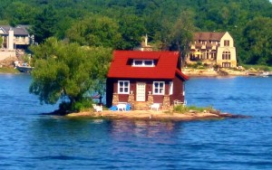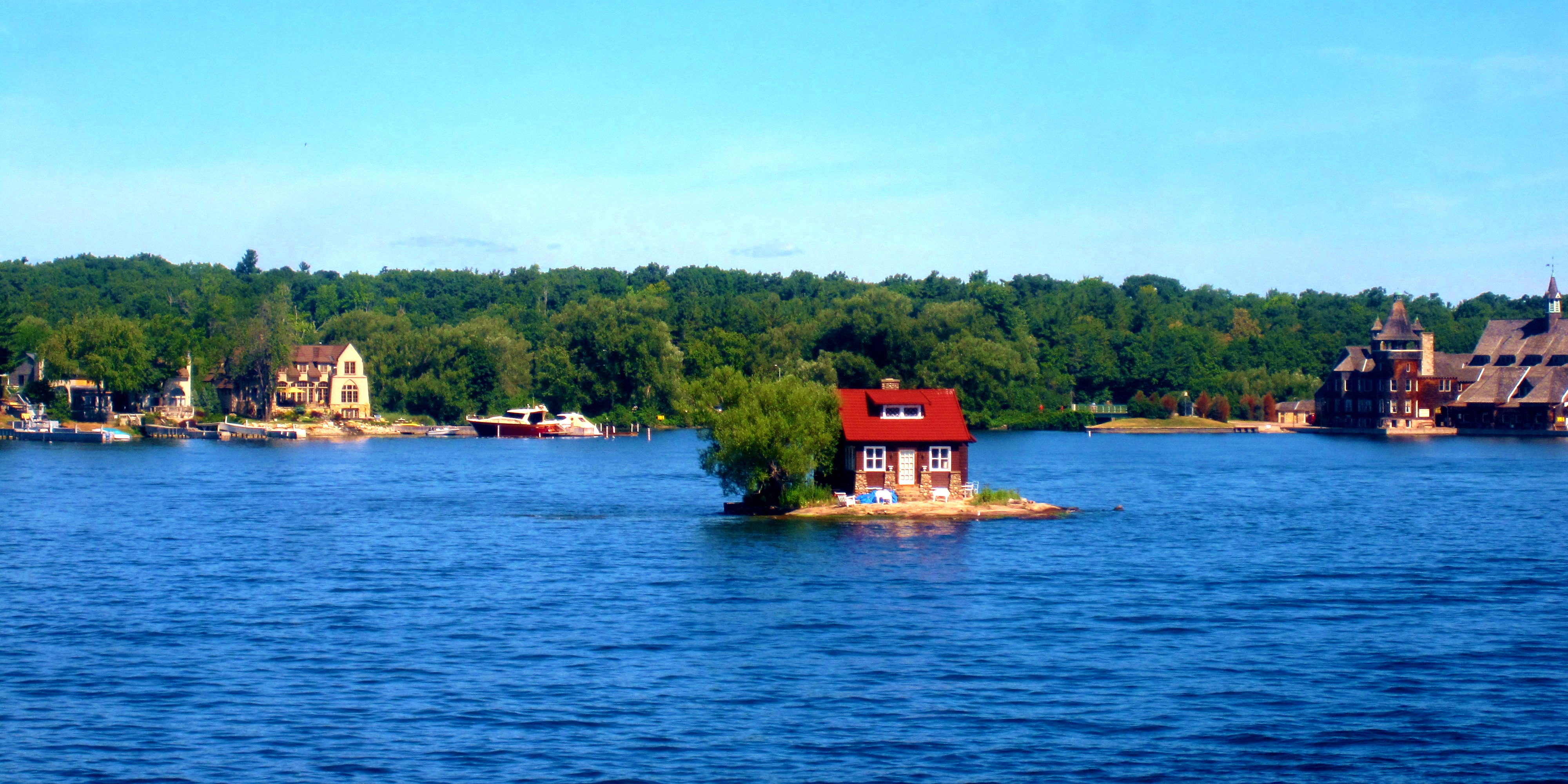 The St. Lawrence River begins at the northeast corner of Lake Ontario, snaking its way toward Quebec City through Montreal, and serves as the border between Ontario and New York. Known as the Thousand Islands Seaway or the St. Lawrence Waterway, the region consists of 1864 islands, and the US/Canadian border zig-zags through the middle of it all. What constitutes an island? Two things: It must be above water 365 days a year and support at least two living trees.