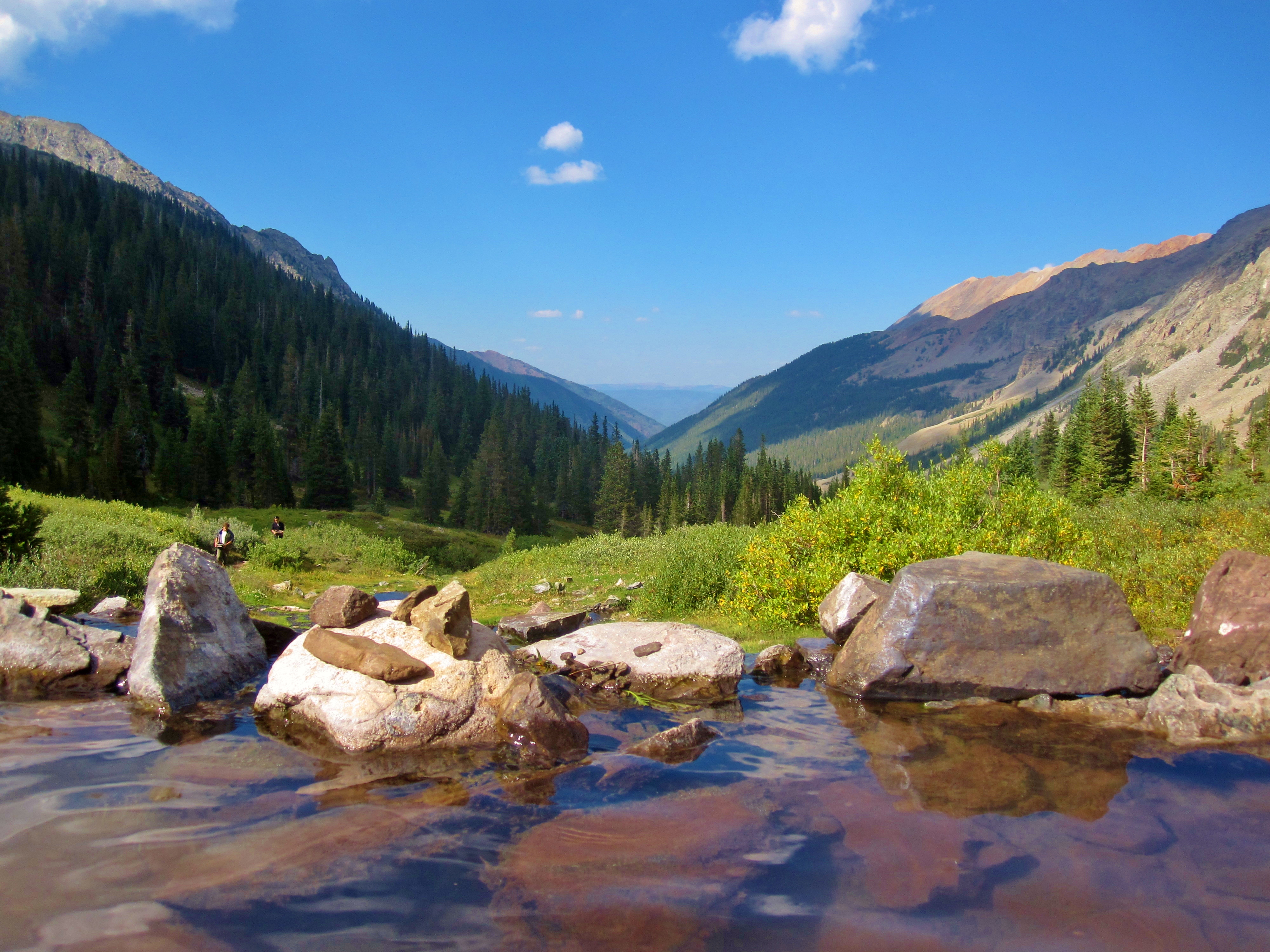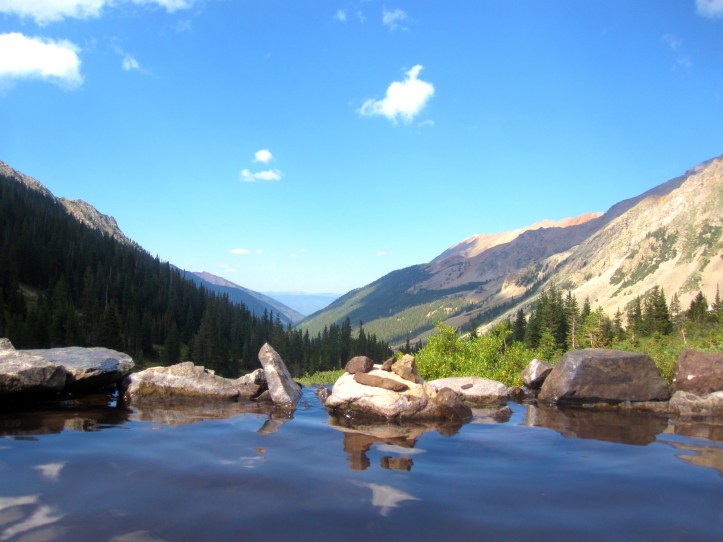 The trailhead is located about 10 minutes from downtown Aspen, where backpackers begin the 8.7-mile journey through alternating forests of pine and aspen trees, through open fields of green grass and wild flowers, the mountains rising up on either side of the rich valley. Waterfalls and rivers are a common sight, and if you’re lucky, elk and moose can be spotted, too. While many parts are uphill and exacerbated by the heavy pack on your back, it’s a relatively mild hike considering the region – the trailhead is at about 8,000 ft and you only gain around 3,000 ft over the course of the nine miles. Most people are able to reach the springs in four or five hours.