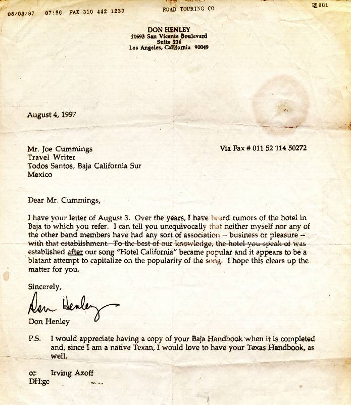 And even more: In 1997, travel writer Joe Cummings became intrigued with the legend. He talked to everyone he could and decided that the stories just didn’t seem right. He sent a fax to Don Henley and asked about the hotel in Todos Santos and the rumors that he and/or the band had been here and possibly even written the song here. To Joe’s surprise, Don Henley immediately returned his fax and stated that “I can tell you unequivocally that neither myself nor any of the other band members have had any sort of association – business or pleasure – with that establishment.” Based on his own research and this fax, Joe wrote “Hotel Where” which was later published in the March 2000 issue of El Calendario de Todos Santos, the local English language magazine.