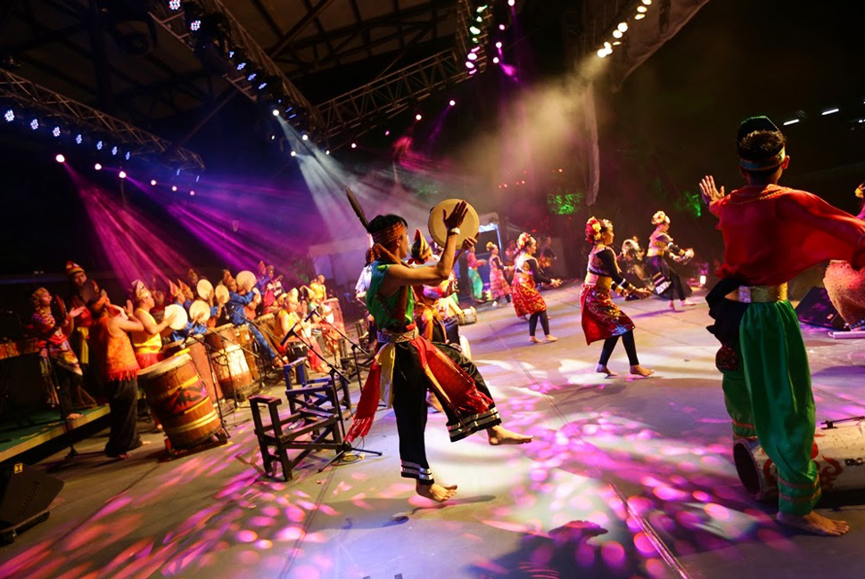 The coast turns the corner where the South China Sea is calm, the low tide more than tripling the size of the beach and revealing the smooth stones that dot the shore. The sun had come all the way up now, the sky changing from purple to light blue, and I could see the tree-covered saddle of Mount Santubong in the background towering over the stages of the Rainforest World Music Festival, set in the Sarawak Cultural Center on the forested coast of Malaysian Borneo.