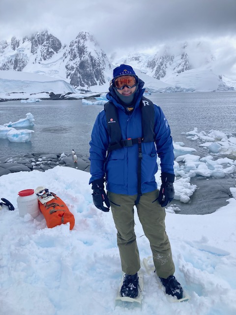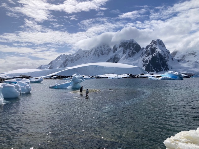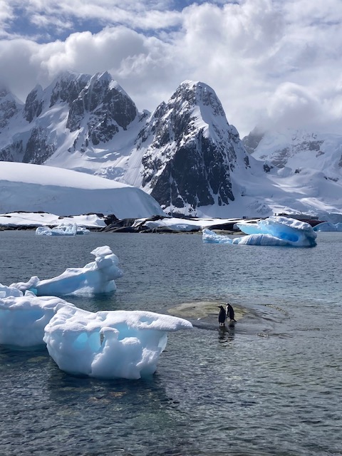 We set off in a line. I’m trying to shake the slight disappointment I feel about not being able to further engage this place, to feel at home, to sit down and take it in. After a few minutes of walking, I begin to feel more comfortable and athletic in my gear, and I begin to relax. It’s impossible to be in a bad mood, to lose gratitude. The sun is peaking out of the clouds, illuminating the ice in the lagoon, and, for the first time, I see the blue of the Antarctic sky beyond the snow-covered peaks. I can see icebergs, humpback whales are spouting, there are penguins on the rocks near the water, and the fresh air feels fantastic. It’s beautiful, and I feel so happy.