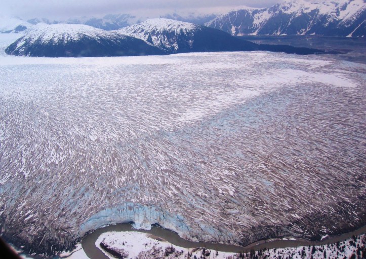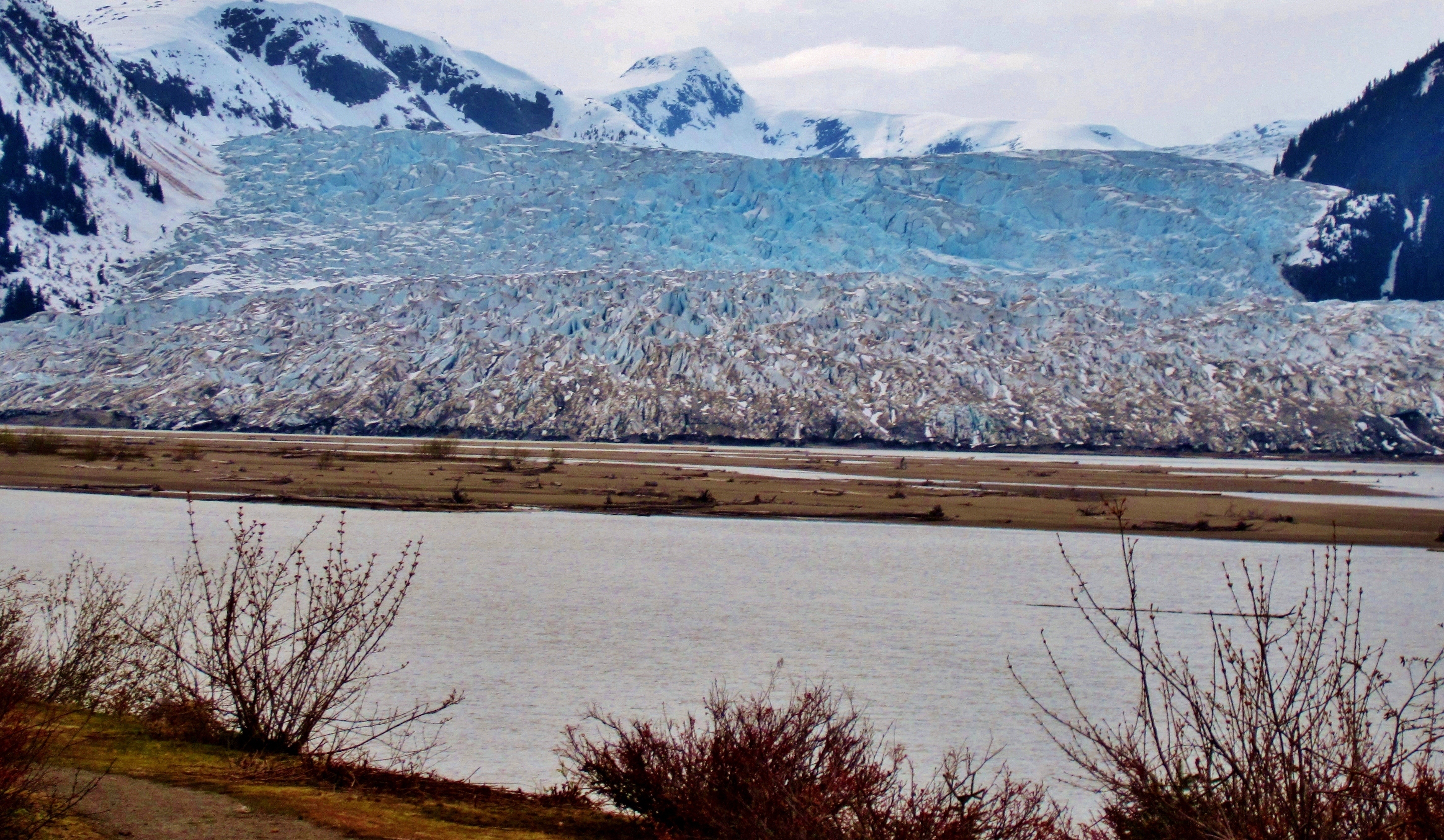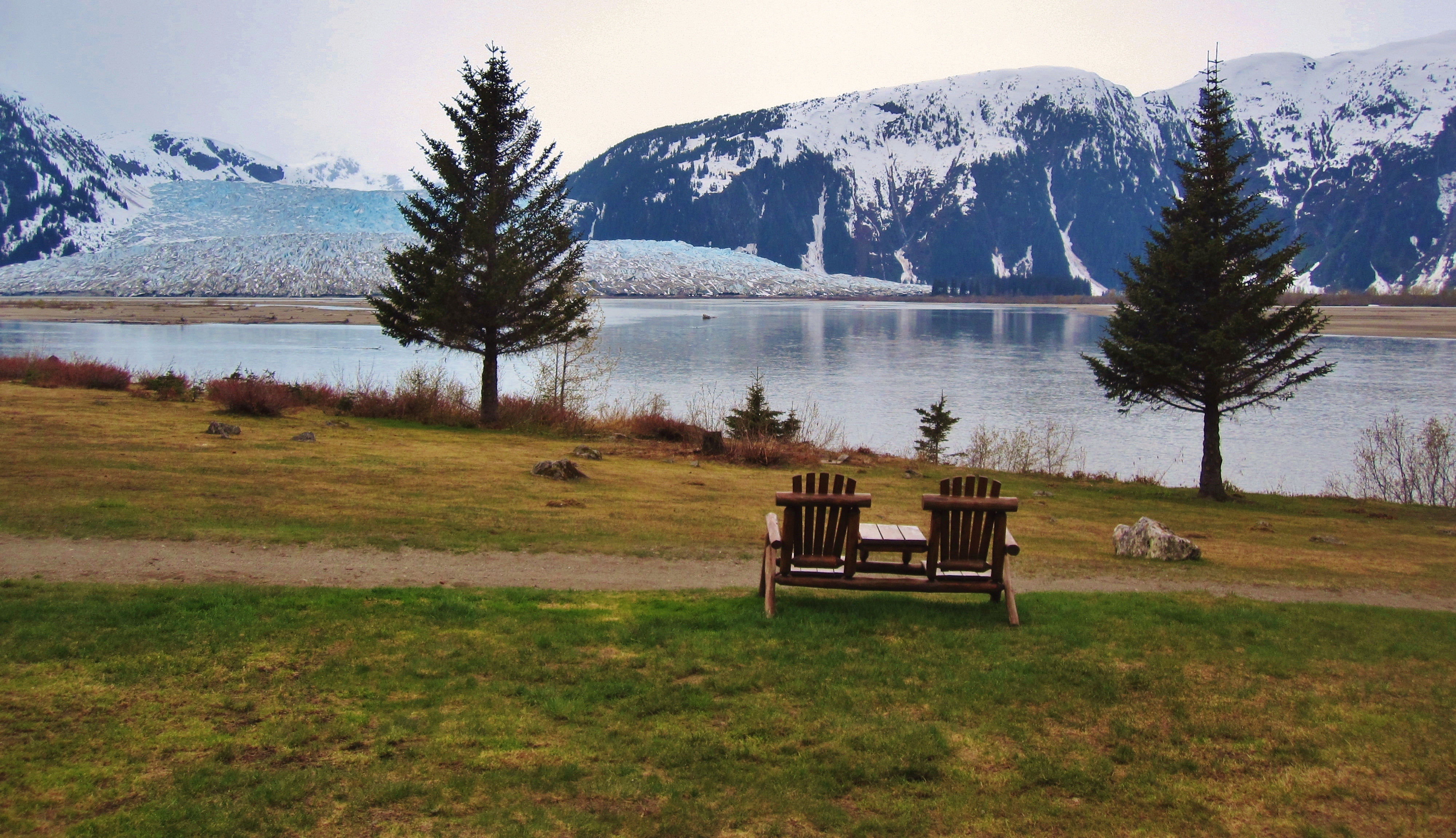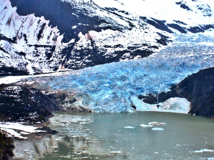 Upon landing on the Taku river (which feels about the same as landing on concrete, although the view out the window is much better) and arriving at the lodge, I sat on a swinging bench on the front porch, looking out over the water, the glacier coming down the mountain to my left. I could see the blue tint in the glacier – the frozen block of ice clearly could not be described as being plain white. Readers in the northern part of America should not picture the snow in their backyards – this was different (the ice is frozen so solid that it pushes out all the oxygen. When light enters it creates a prism, producing the blue hue).